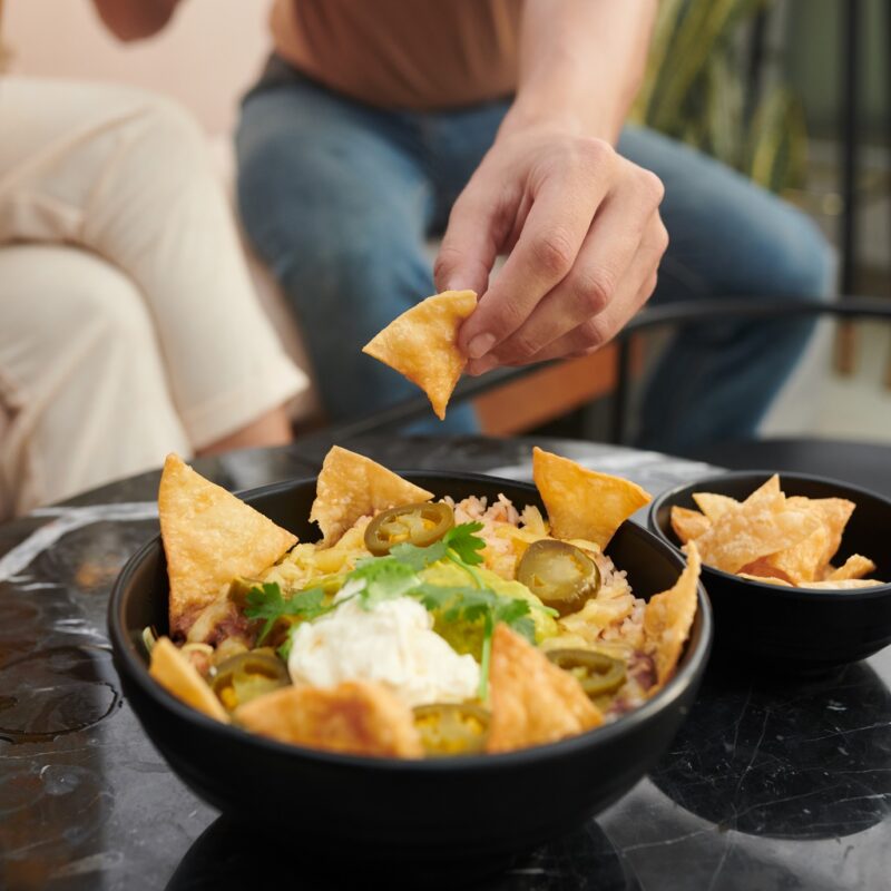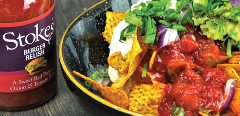 For a simpler Nacho Sharer, all you need is the nachos, sliced red onion, sour cream, melted cheese and coriander garnish – oh yes … Stokes Burger Relish. It’s a rich, slightly sweet tasting red pepper, tomato and onion salsa with a subtle note of chilli.