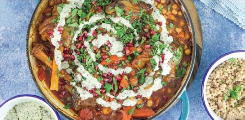 To the Mediterranean coastline of North Africa – Tunisia or Morocco – for Lamb Tagine served with sweet peppers and vegetables couscous and tabbouleh.